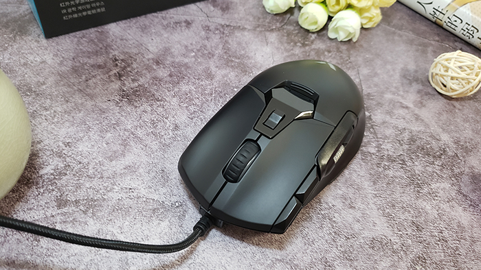 与传统三键式鼠标相比,这款鼠标这款游戏鼠标采用的 12 个可编程按键设计。除了左右键和滚轮中键之外,当然对于游戏鼠标可以调节 DPI 键自然是少不了,这枚按键就设置在中间位置。鼠标后部还有一颗雷柏标志的 logo 灯以及尾部线条背光灯设计。