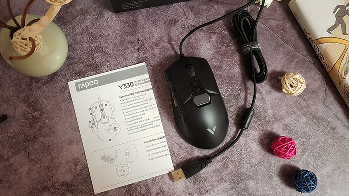 将所有配件取出,除了雷柏 V330 游戏鼠标之外只有一张说明书。而在鼠标线方面,没有采用可拆式设计,也采用传统的一体式设计。