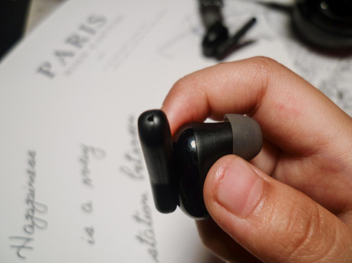 打开充电仓后,便能看见耳机本身了,仪式感十足。耳机和充电仓一样是纯黑色的,一旁还标注了"L"和"R"以区分左右。