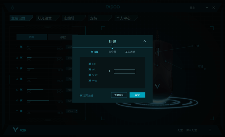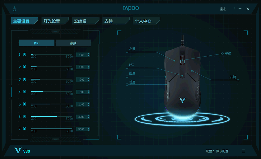同时雷柏V30还支持驱动程序,下载安装后,可以进行按键、DPI、灯光、宏等定制设置,可玩性更高。有驱动后DPI可以调到最大5000。7档DPI每档都可以在主要设置中进行自由调节。而且还可以进行在线固定升级和个人配置上传保存以及背光灯模式设置,除此驱动中能进行按键组合、宏编辑以及基本功能设置。