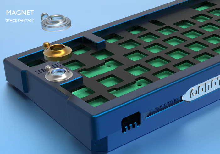 底板上有一个可更换的配重铭牌,因为键盘整体重量已经足够,我们没有设计特别的配重块,底部铭牌有四种,分别代表:天文学家、动植物学家、地质学家、机械工程学家,在GB时键盘会玩家可以自由选择其中一块铭牌。