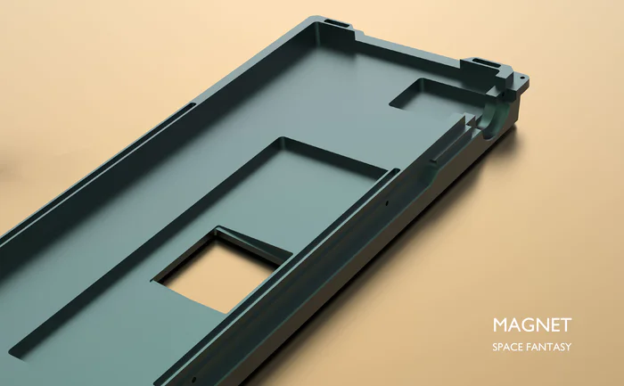 从结构说起,我们最早考虑的是Integrate Mount,因为有比较多的设计元素在键盘侧面,比如蓝牙窗口、Quote铭文条,以及一个贯穿正面侧面底面的大铭牌,加上使用了悬浮结构,Intagrate Mount是一个比较稳妥和省力的选择,最后为了更好的手感,我们还是选择了Gasket Mount,尽管这意味着有很多棘手的问题要解决,我们尝试了很多版的设计方案,终于找到解决的办法,比如这里悬浮结构(下图),由于底板的角度和悬浮结构设计,从底板直接贯穿螺丝会导致很多问题,比如会使上板边框变宽,受力角度问题导致Gasket结构中上额头和下额头受力不均匀等等,我们在四角台阶处悬浮结构的背面做了螺丝固定,这样不会加宽上板边框的同时,保持整个面受力均匀,上板和底板可以通过橡胶垫平稳的把定位板夹在中间不变形。更多的就不展开了。