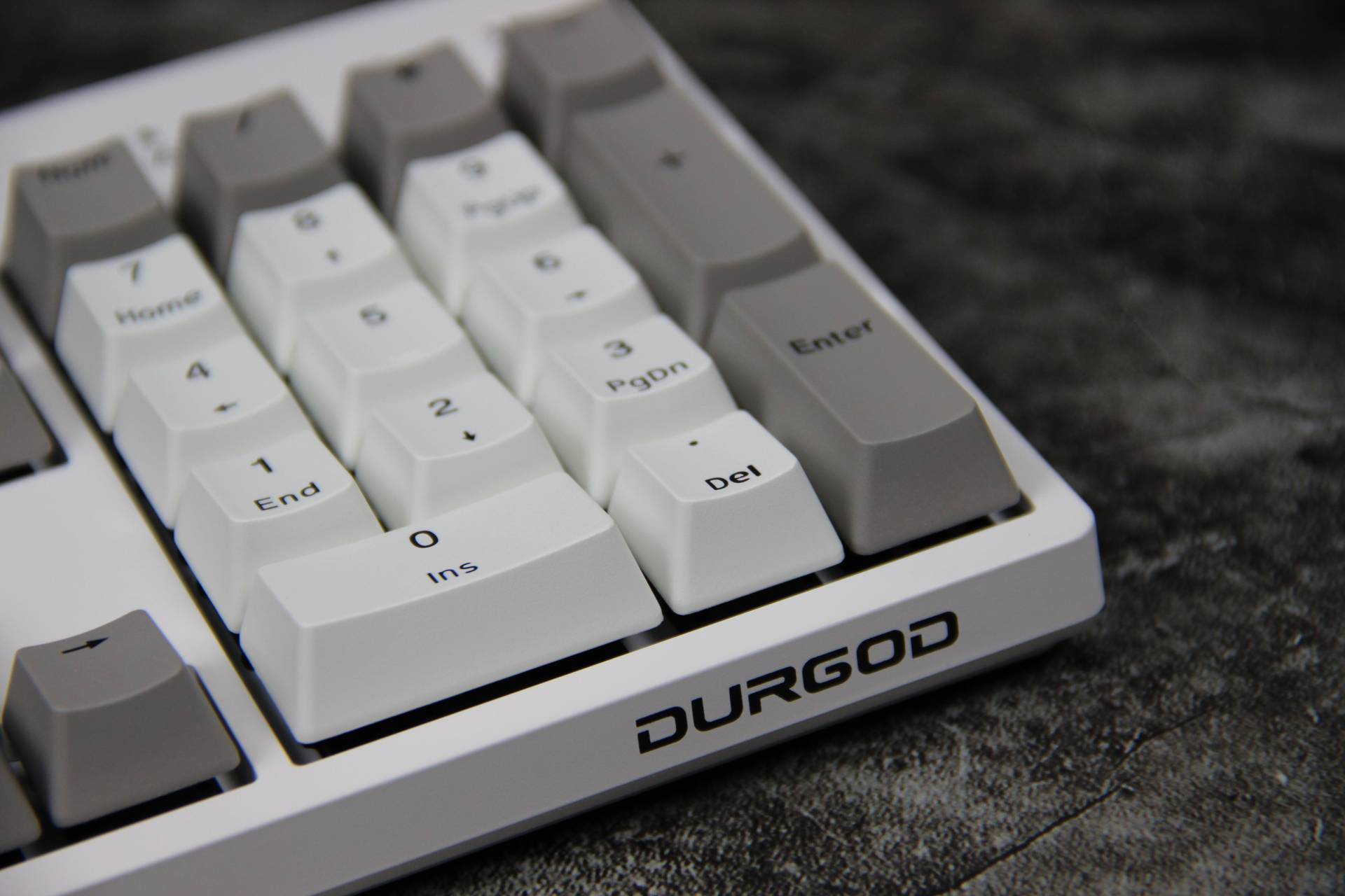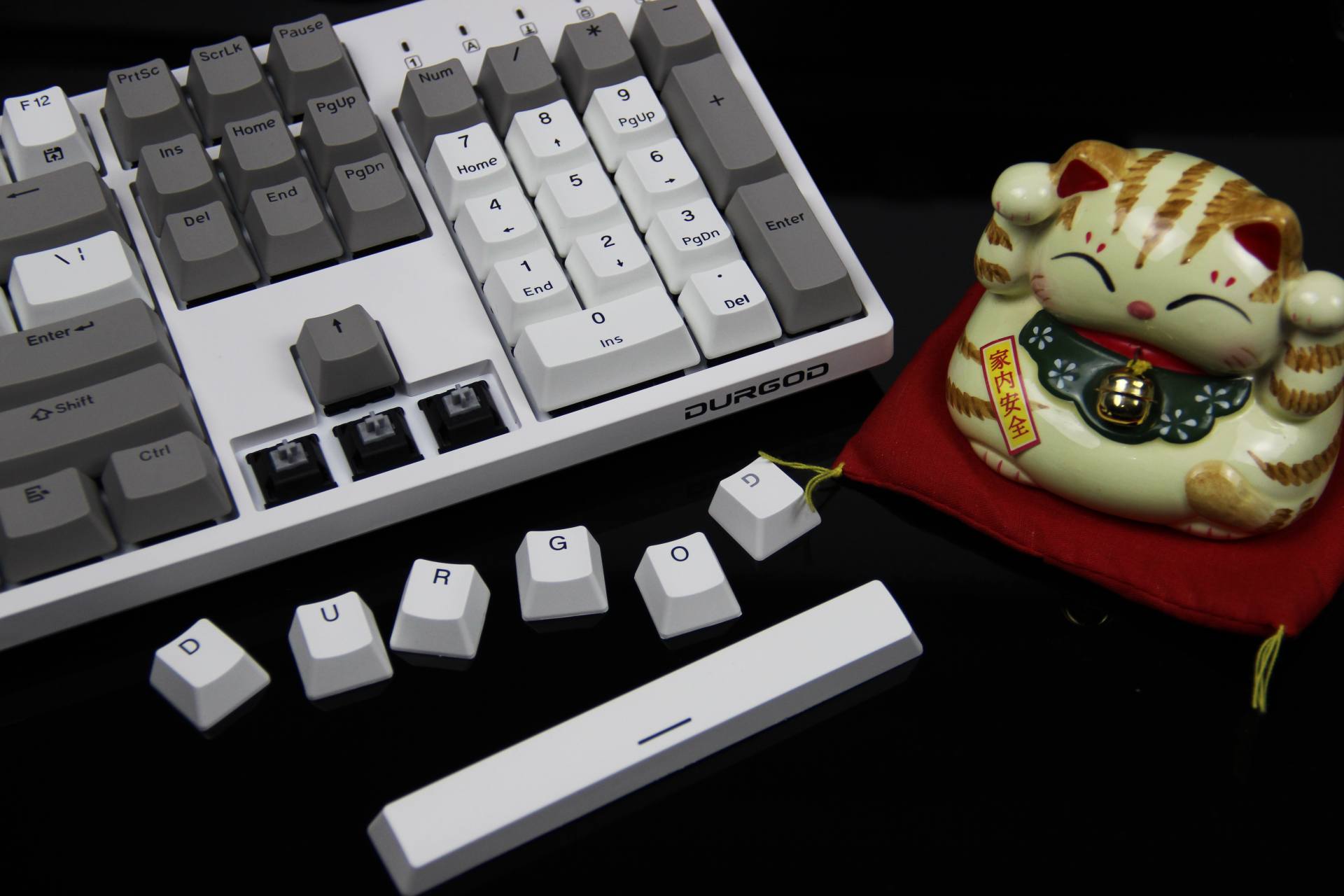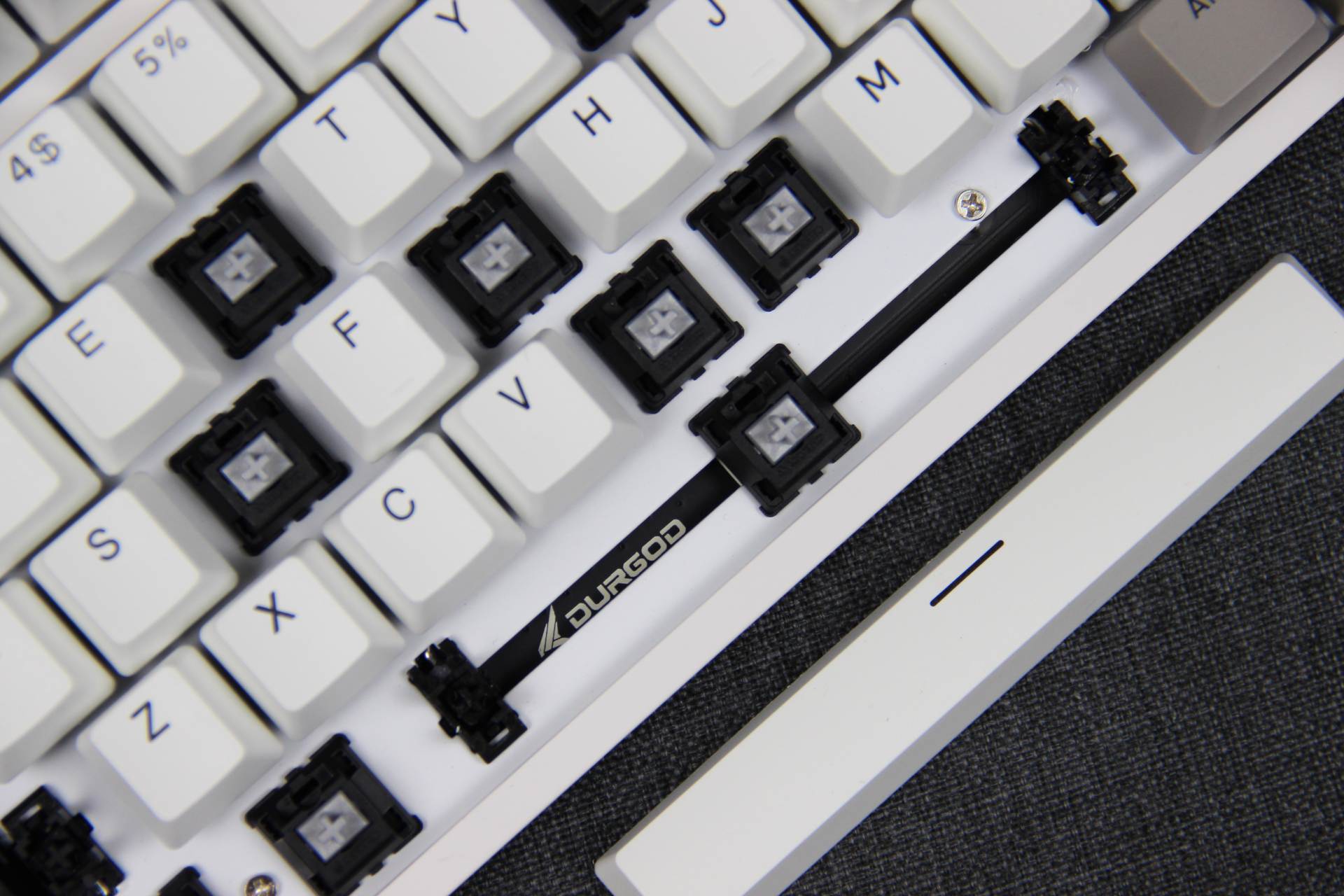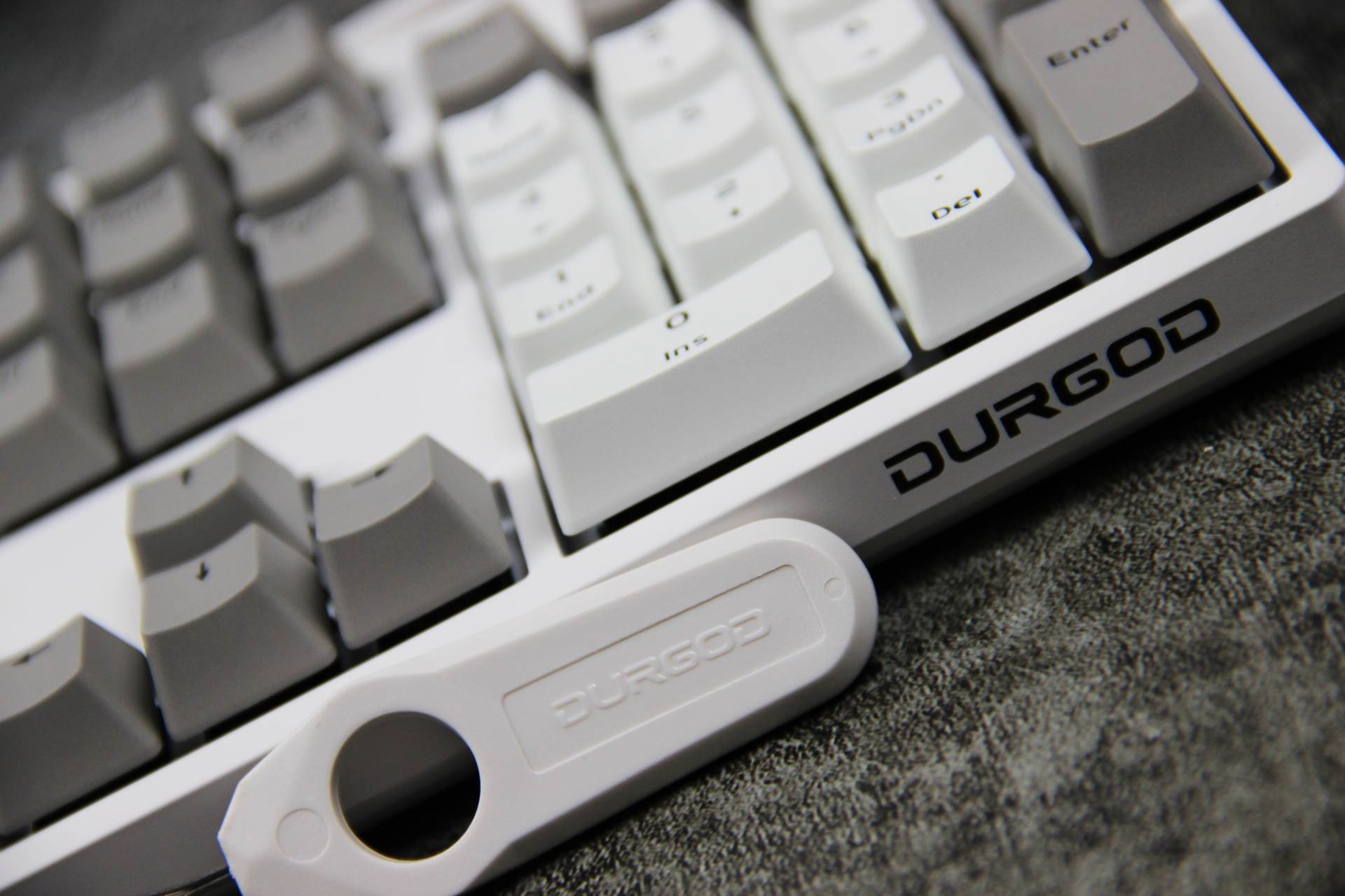 键帽磨砂表面质感十足,双色闭口字体键帽耐久性强,异常耐磨的特性保持持久续航能力。 键帽拼凑“DURGOD”杜伽的品牌,发现少了一个D,只好从其他键盘拆下一个凑数~ 下、左、右键拆除,寓意持续向上,希望自己2021年持续向上发展。