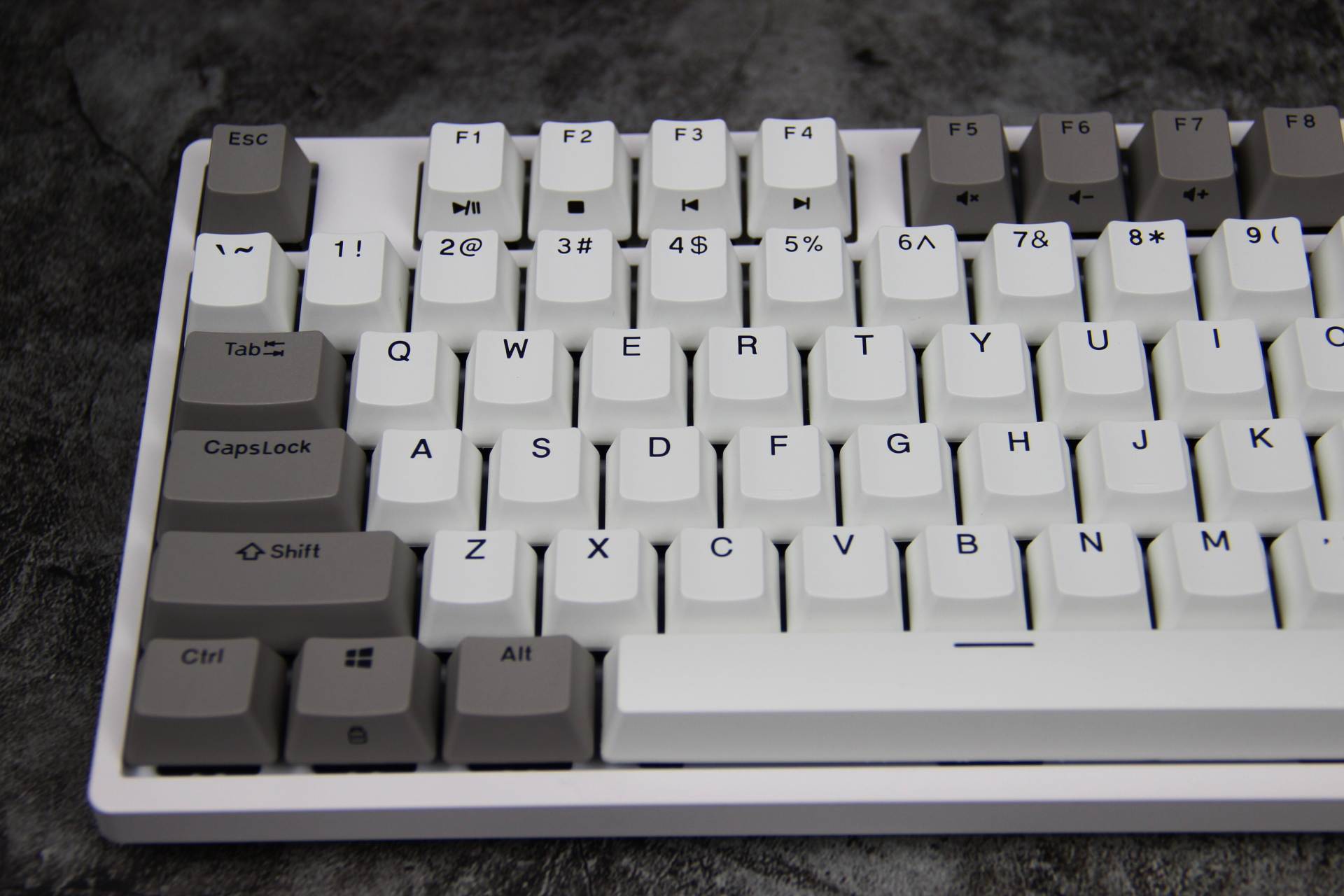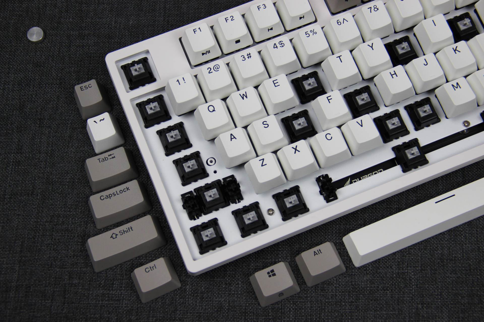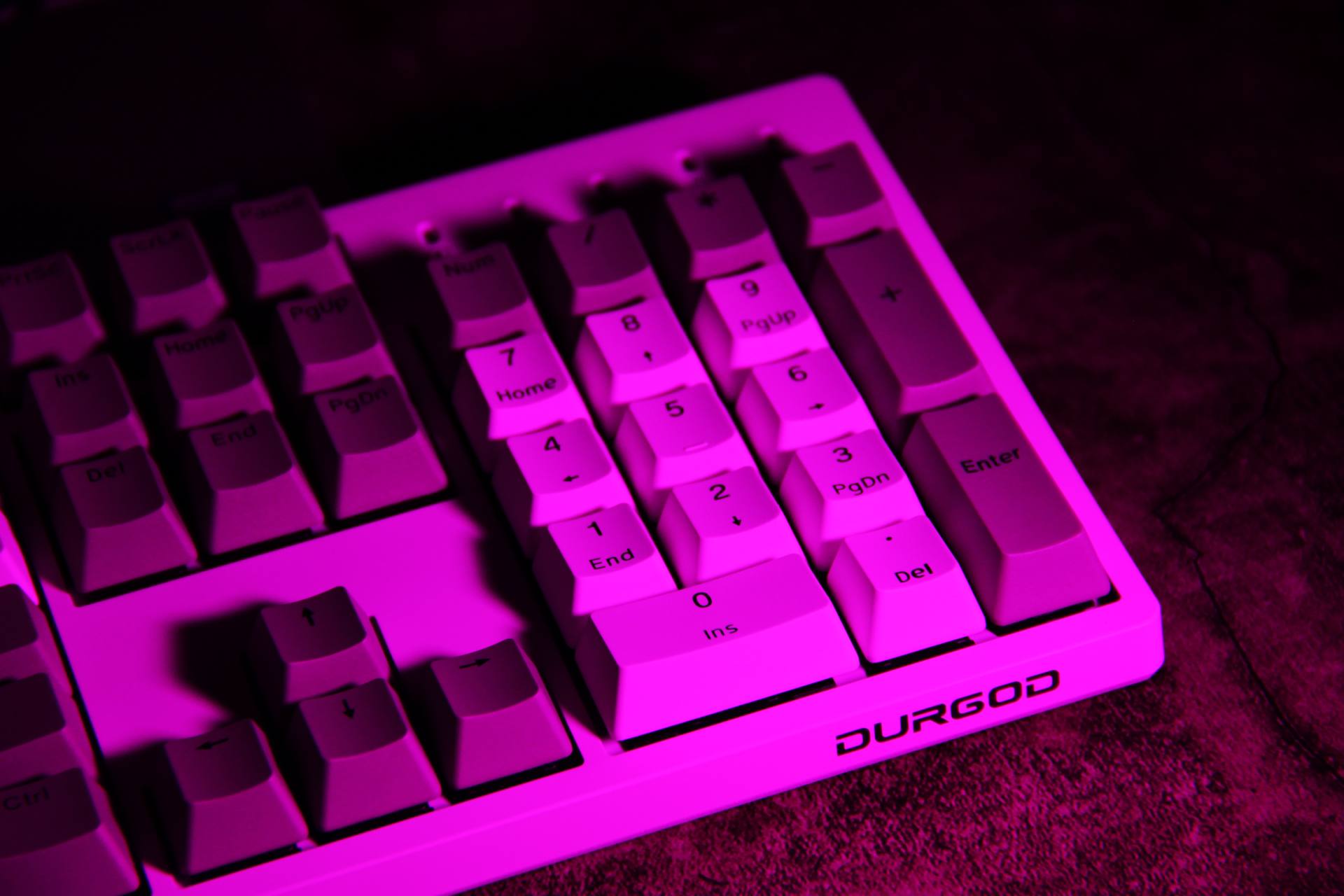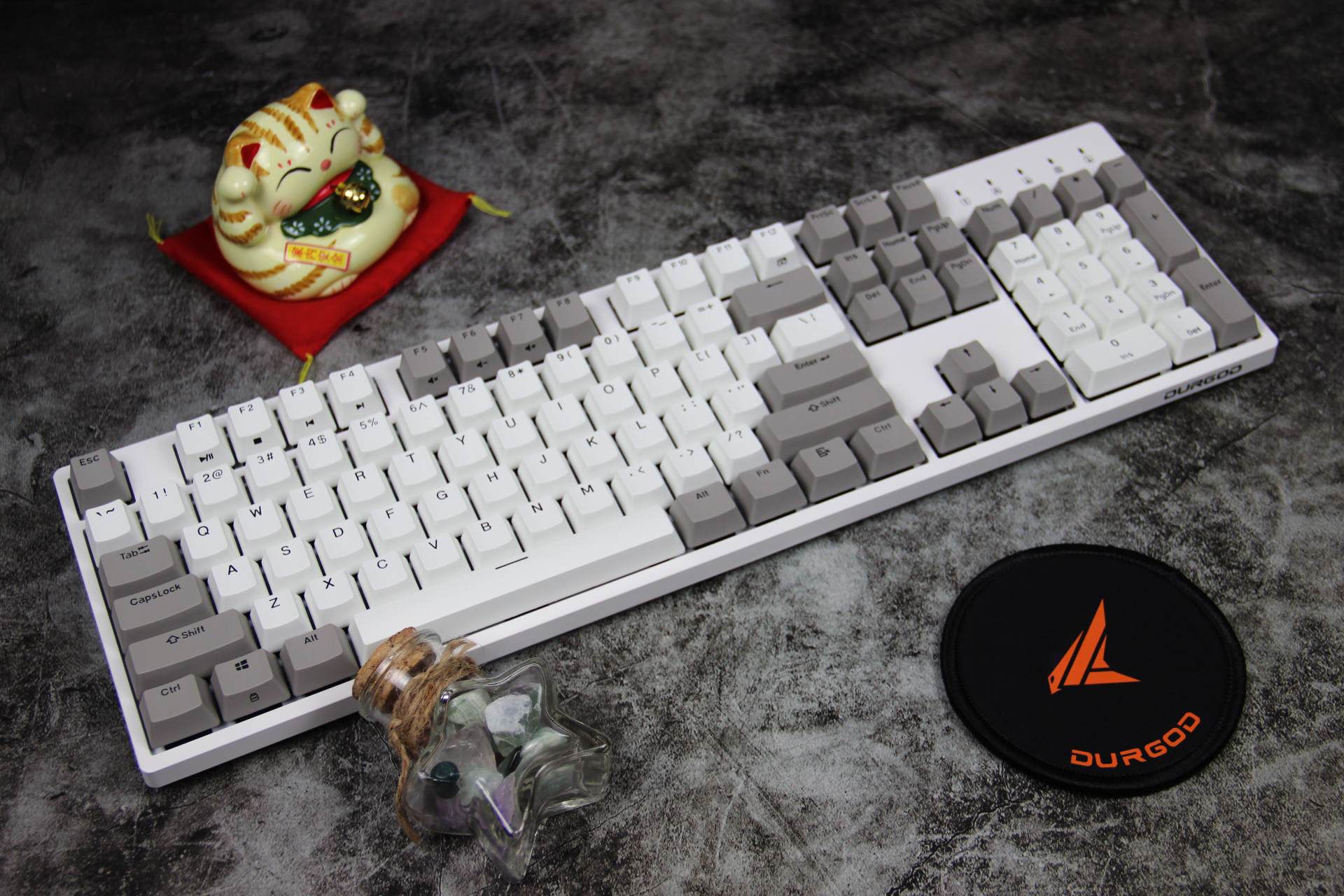 键帽磨砂表面质感十足,双色闭口字体键帽耐久性强,异常耐磨的特性保持持久续航能力。 键帽拼凑“DURGOD”杜伽的品牌,发现少了一个D,只好从其他键盘拆下一个凑数~ 下、左、右键拆除,寓意持续向上,希望自己2021年持续向上发展。