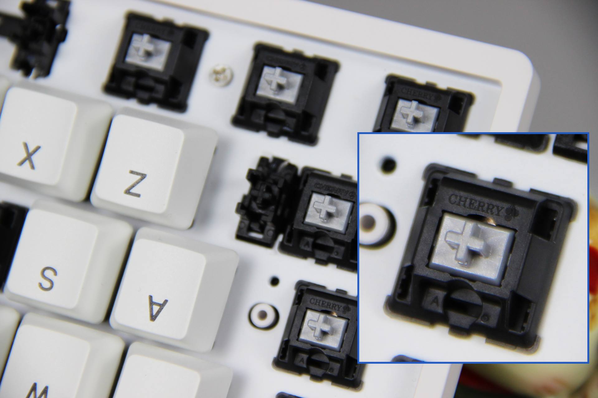 德国原厂樱桃轴的做工细节在放大之后精准亮相。细节见做工,樱桃厂家品牌字母清晰可见,没有字体毛刺、失真等表象,甚至连小小的樱桃图案也异常清晰。