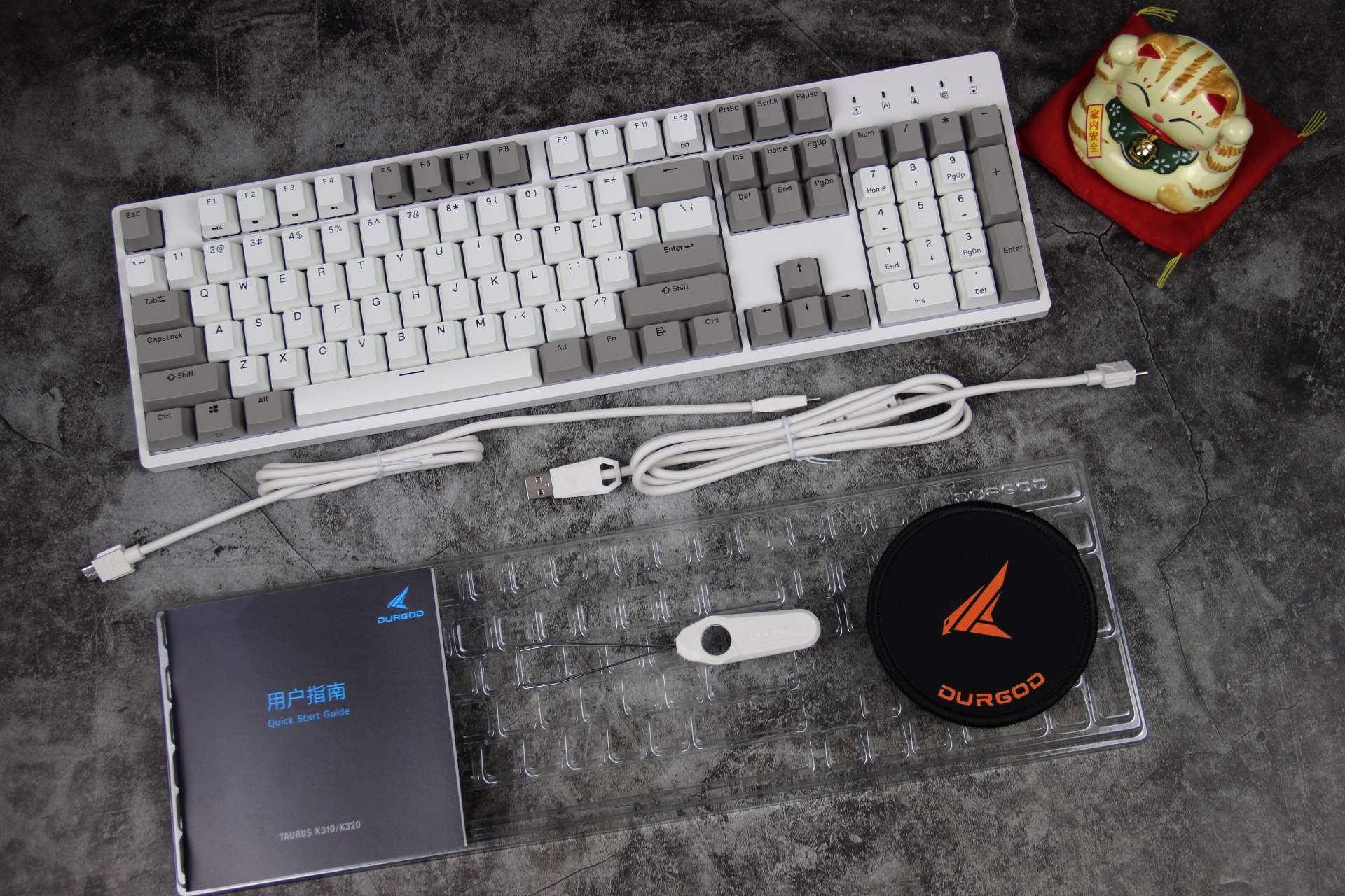 键盘主体选用干干净净的天然白色——介乎于象牙白与亮白之间的颜色,视觉感受比较养眼。搭配同样金属质感的灰色,与类肤质感的天然白一起,打造白-灰的静谧情景。 开箱,全家福展现!发现键盘一把、传输线2条(TypeC-TypeC、TypeC-USB各1条)、说明书、拔键器、杯垫、防尘罩一用俱全。 K310采用键线分离设计,USB/TypeC双模连接通过TypeC-TypeC、TypeC-USB配线实现。 PS:然而后来无意间在包装盒内发现蓝白配色的杜伽定制款的集线魔术贴,本次未能出镜。