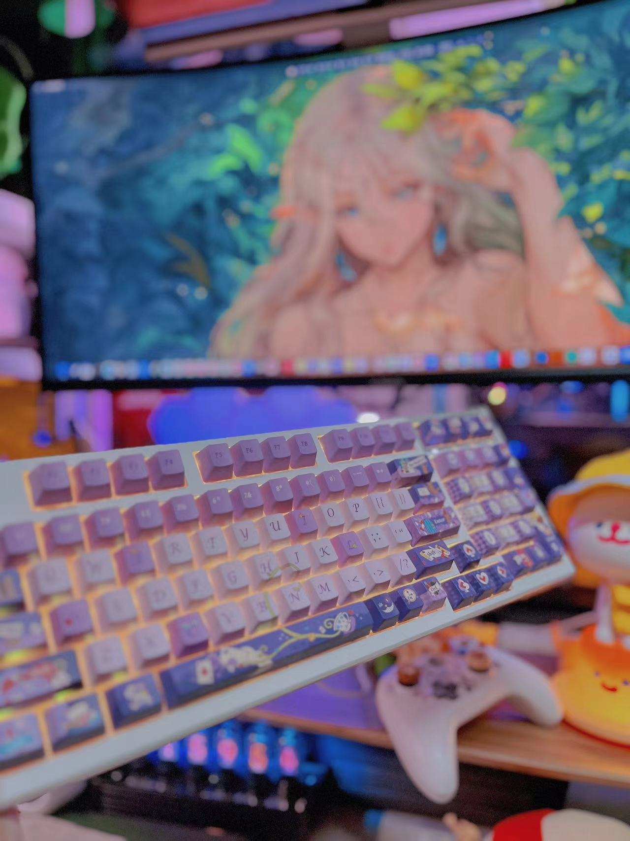 另外一套是爱丽丝梦游仙境,整体键帽是紫色的,配在FL980的键盘上,再开背光效果,绝了!这套键帽的配色和图案都很童话风,女生千万别入手,因为男生用很骚hhh