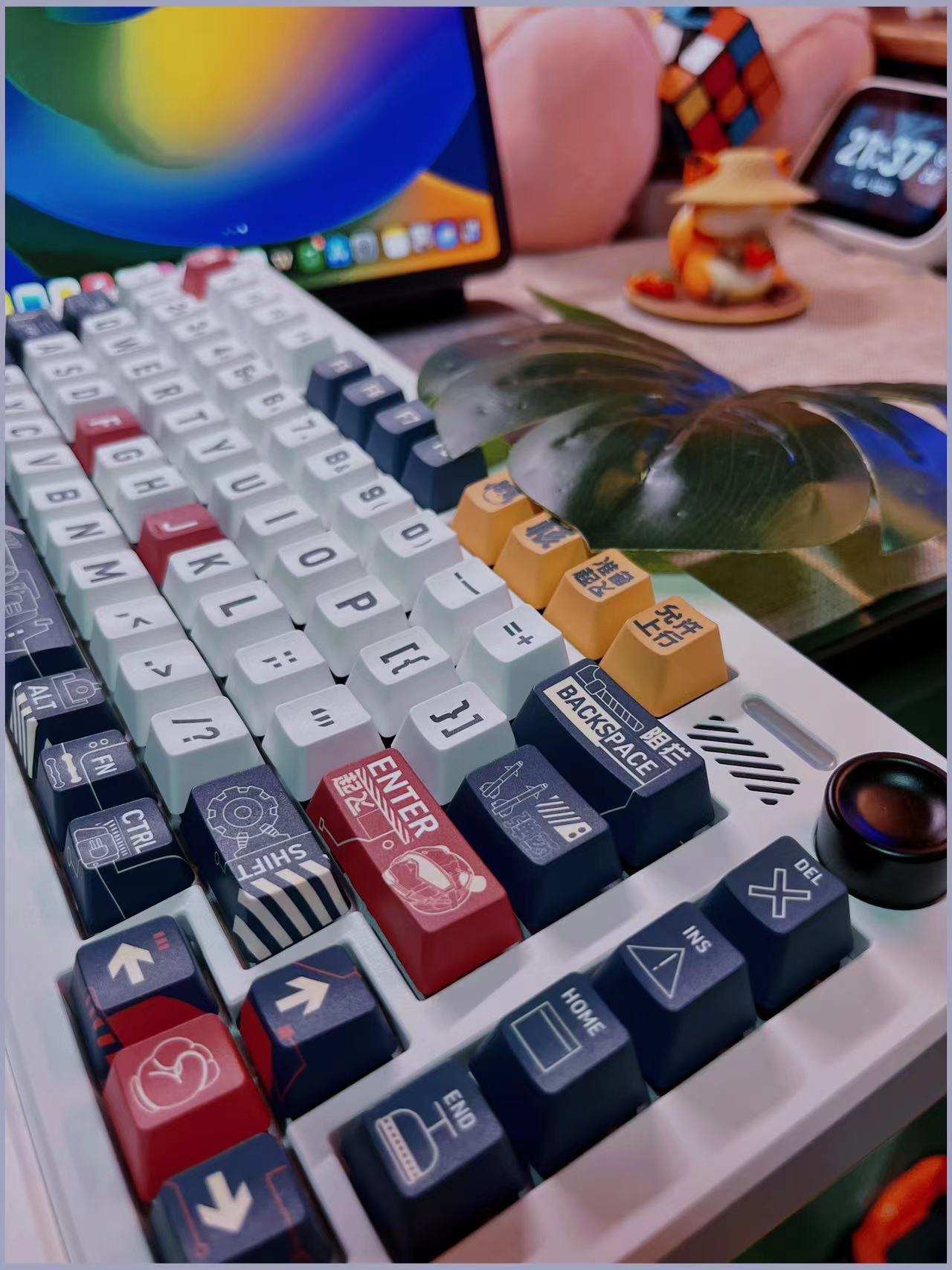 首先说说熊猫这款的配色,之前我一直觉得大字符会让人觉得傻傻的,但是确实大字符的看得更清晰是不可否认的,里面的细节很有未来感,配色很简单,白、深蓝和深红,我把这套键帽装在铝厂的ZX75键盘上更增加了这种科技感!适配还是挺好的,男生用很帅!