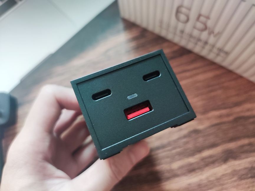 UIBI柚比65W智充集装箱的插孔均可以一起使用,侧面的笑脸区中,两个Type-C口单独使用时最高可以实现65W大功率充电,USB孔单独使用时也能够实现22.5W快充,双口、三口搭配使用时左上角的Type-C口仍然能够达到45W快充,整体的体验是非常不错的。