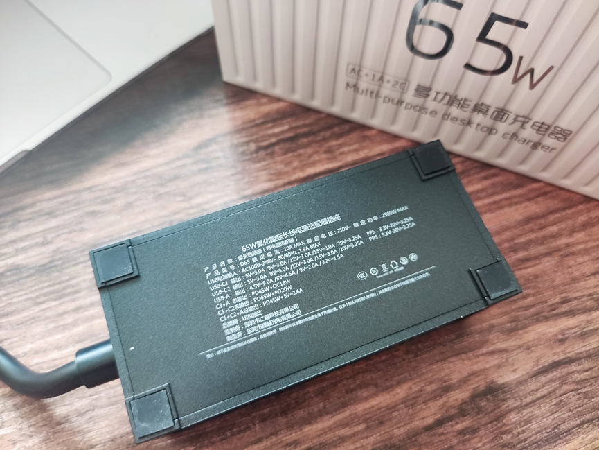 物如其名,UIBI柚比65W智充集装箱插线板的设计风格不同于传统传统插线板,采用集装箱风格设计,更显潮流炫酷,不仅是一个优秀的插线板,还是一个炫酷的桌搭道具,解决用电需求的同时美化桌面,这也是我为什么会选择这么一款产品的原因之一。底面除了产品信息外,在四个角还设有硅胶防滑垫,保证使用时能够稳固的站在桌面上。