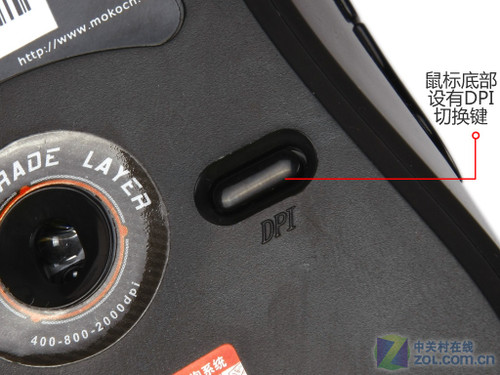 魔技G700高精度游戏专用鼠标 底部细节 在魔技G700高精度游戏专用鼠标的底部设有DPI切换按键,玩家可以在400/800/2000DPI三档之间随意切换,办公游戏通用。而且不容易被误按到,设计十分人性化。镀金的USB接口设计,更加坚韧、耐用,并且提供卓越的电传导性,使得高速传输数据即快又准,能最大限度的发挥性能。
